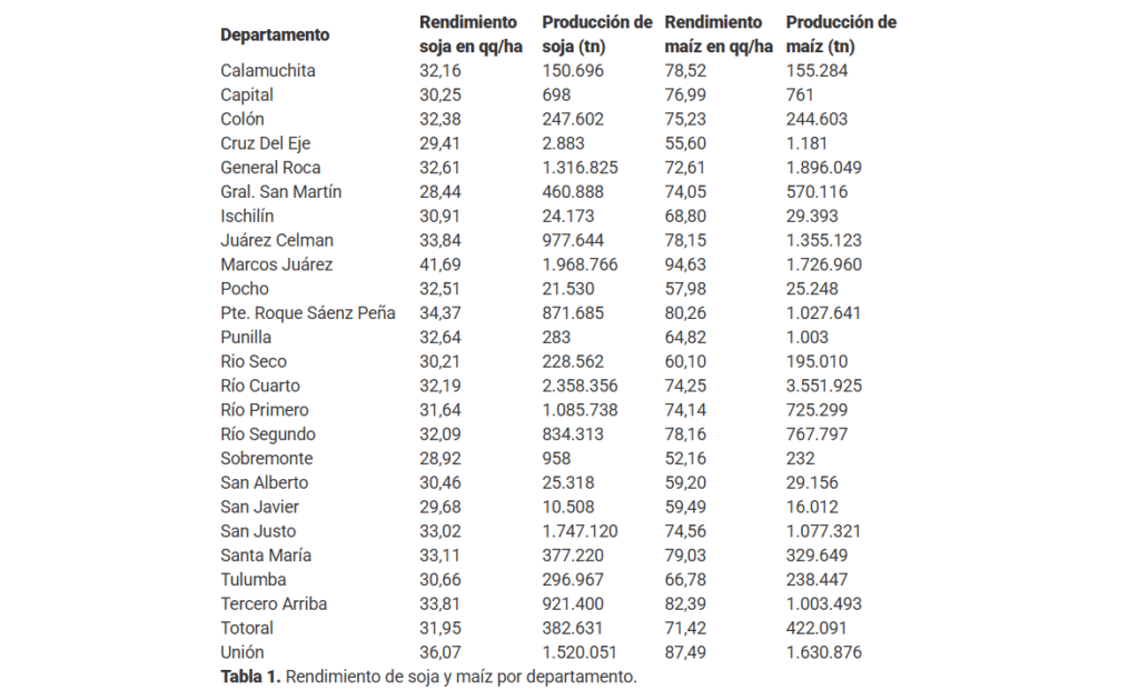 Los departamentos del sureste provincial (Marcos Juárez, Unión y Tercero Arriba) mostraron los rendimientos más altos, con más de 33 qq/ha en soja y más de 80 qq/ha en maíz. En contraste, en el norte de Córdoba los rindes de maíz rondaron entre 55 y 70 qq/ha.