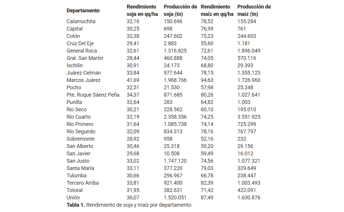 Los departamentos del sureste provincial (Marcos Juárez, Unión y Tercero Arriba) mostraron los rendimientos más altos, con más de 33 qq/ha en soja y más de 80 qq/ha en maíz. En contraste, en el norte de Córdoba los rindes de maíz rondaron entre 55 y 70 qq/ha.