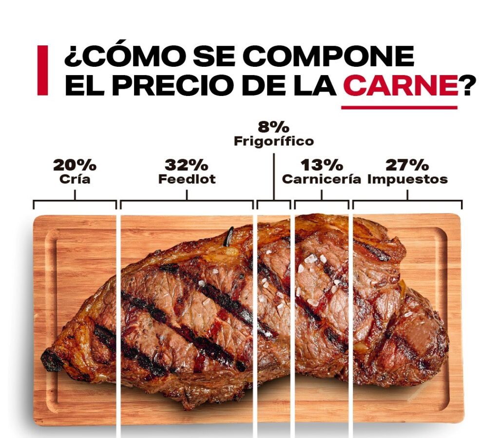 Finalmente, en el precio de la carne bovina la cría representa el 20%, el feedlots 32%, frigorífico 8%, carnicería el 13% y los impuestos el 27%. El maíz representa sólo 11% del precio final de la carne vacuna, el 15% de la de cerdo y 18% en carne aviar.
