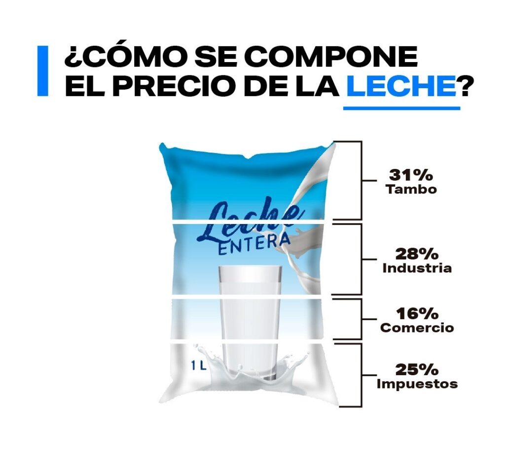 En cuanto al precio del sachet de leche entera, el tambo representa el 31%, la industria el 28%, el comercio 16% y los impuestos el 25%. Cabe destacar que el maíz representa el 5% del precio del sachet al consumidor. En el caso de la leche se detalla que casi el 75% son costos de producción, 25% impuestos y se registra un -0,1% de pérdida de la cadena. De los impuestos que paga la cadena, el IVA representa el 69%.