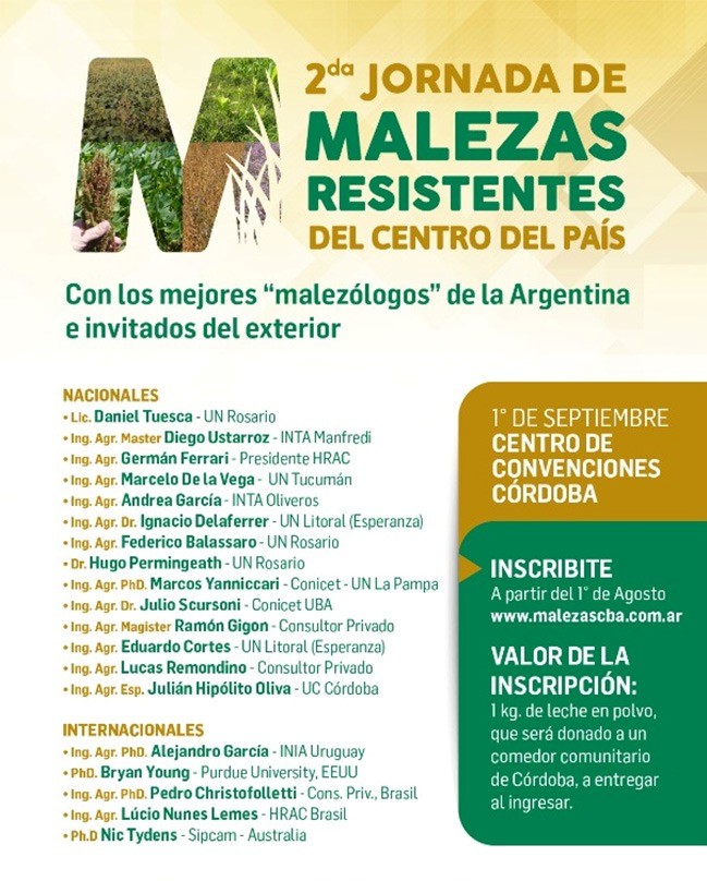 El jueves 1° de Septiembre se realizará una nueva Jornada Nacional e Internacional de Malezas Resistentes del País, en el Centro de Convenciones de Córdoba, ubicado en el Complejo Ferial (Avenida Ramón Cárcano (Circunvalación).