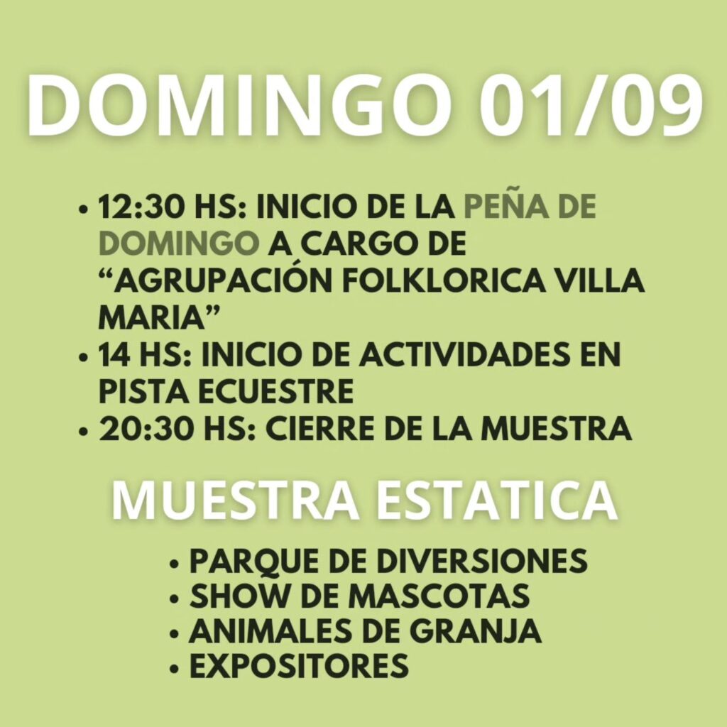 Por la tarde, se realizarán actividades, ecuestres, incluyendo una exhibición de pato a cargo del equipo “La Mestiza” de Villa María, junto con demostraciones de destrezas gauchas.