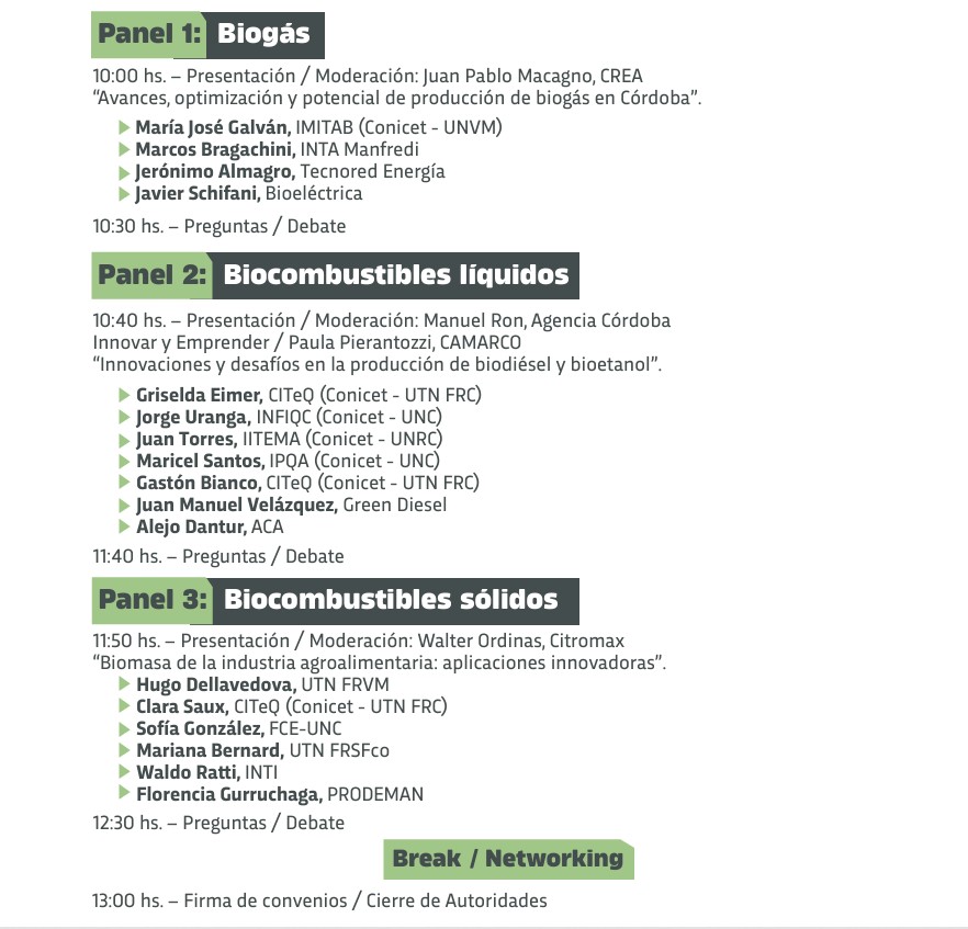 El programa del evento incluye paneles dedicados al biogás, biocombustibles líquidos y biocombustibles sólidos, moderados por destacados expertos y con la participación de investigadores del sistema científico – tecnológico y representantes de los sectores público y privado de la provincia de Córdoba.