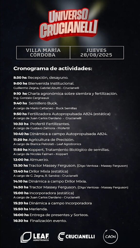 El próximo jueves 28 del corriente se concretará en el predio que el Grupo Caon posee en Villa María, sobre la Autopista 9, una nueva edición de Universo Crucianelli. El evento servirá para que productores, técnicos y contratistas vean en acción a la Fertilizadora Autopropulsada A 824, la sembradora Drilor Mixia y la Incorporadora de la marca. A su vez, se realizarán charlas técnicas acerca de los equipos en cuestión, y además sobre siembra, fertilización, tratamiento biológico de semillas y agricultura de precisión, a cargo de especialistas de empresas proveedores de esos insumos.