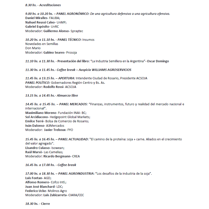Asimismo, se llevará a cabo la presentación del libro “La Industria Semillera en la Argentina” y el acto de apertura contará con la presencia del Intendente de la Ciudad de Rosario y el Presidente ACSOJA, Rodolfo Rossi.