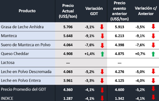 Continúa la tendencia bajista en el mercado lácteo internacional. En la última subasta de la cooperativa neozelandesa Fonterra cayeron todos los productos, menos el queso cheddar. La leche en polvo descremada tuvo una baja mayor, del 5,2 %. La tonelada cotizó a US$ 4.063.