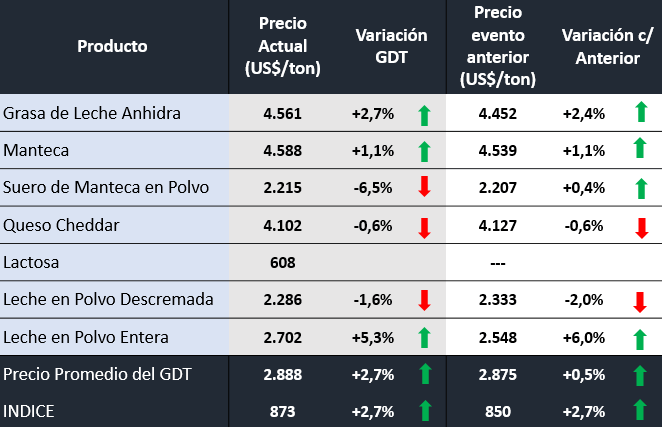 Subió 5,3% en el último evento del GDT, aunque sigue por debajo de las expectativas de exportadores. ¿A cuánto cotizó?